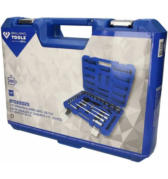 Der 25-teilige BRILLIANT TOOLS Steckschlüssel-Satz BT022025 ist nach DIN gefertigt. Das gesamte Set hat einen 1/2″ (12,5 mm) Innenvierkant-Antrieb. Das Set wird in einem praktischen Koffer mit Metallscharnieren und Verschlüssen mit klemmgesicherten Werkzeugen geliefert. Die Beschriftung im Koffer ermöglicht ein rasches Finden der passenden Einsätze. Die 2-Komponenten Umschaltknarre verfügt über einen Rechts-/Linkslauf mit Hebelumschaltung und einem Rückschwenkwinkel von 5°. Diese ist feinverzahnt mit 72 Zähnen.