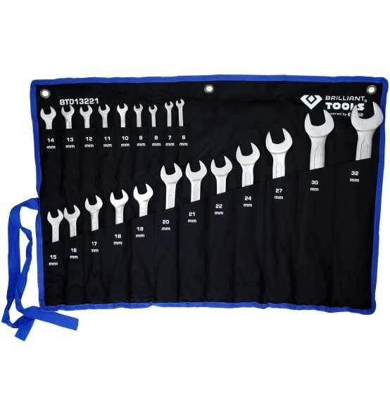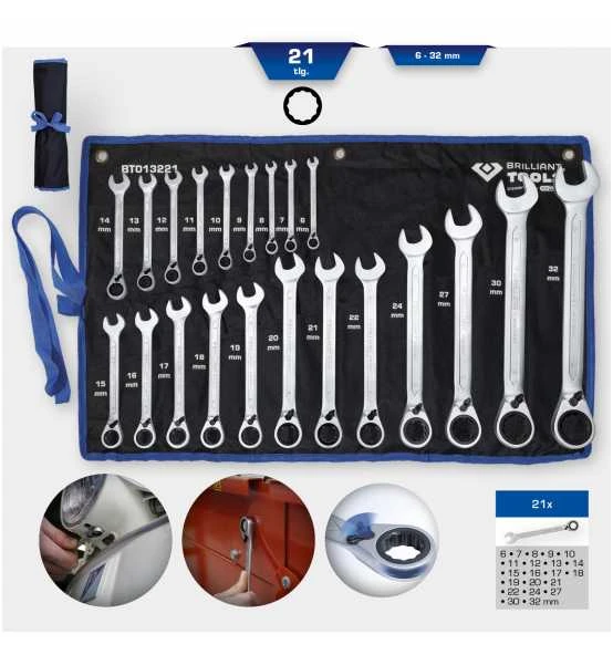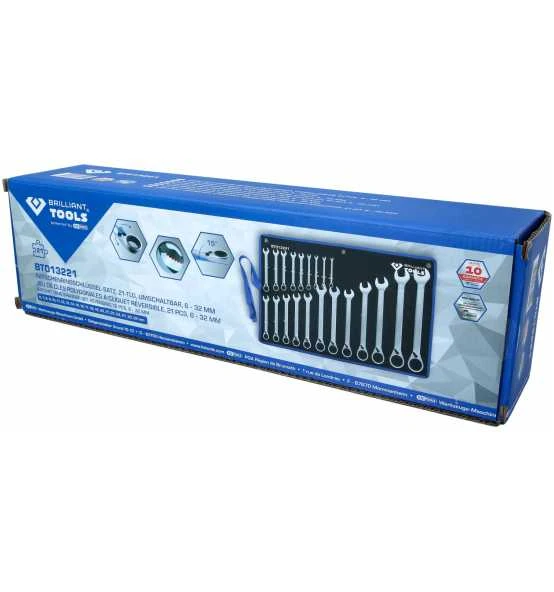Der 21-teilige BRILLIANT TOOLS Ratschenringschlüssel-Satz BT013221 wird in Anlehnung an DIN 3113 gefertigt. Die metrischen Ringschlüssel mit Ratschenfunktion sind feinverzahnt mit 72 Zähnen und haben einen Rückschwenkwinkel von 5°. Die Schlüssel haben einen umschaltbaren Ratschenkopf der um 15° abgewinkelt ist. Die Maulstellung ist ebenfalls um 15° abgewinkelt. Eine Umstellung der Ratschenfunktion (rechts links) erfolgt komfortabel durch Bewegen des Umschalters. Die Oberfläche ist matt verchromt, dadurch liegt er auch besonders gut in der Hand. Der Ratschenringschlüssel-Satz mit den Größen 8 mm bis 32 mm wird in einer praktischen Aufbewahrungstasche geliefert die mit Aufhängeösen ausgestattet ist.
