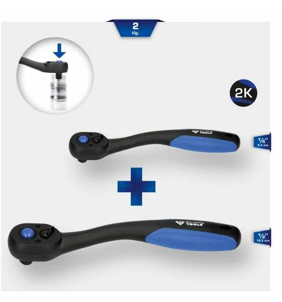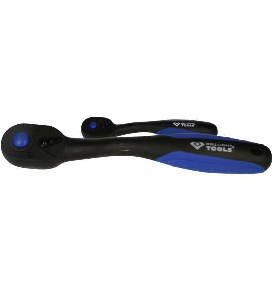Der BRILLIANT TOOLS Umschaltknarren-Satz BT023002 ist für Profis und Hobbyhandwerker geeignet. Dank der Druckknopfauslösung können Steckschlüsseleinsätze und Verlängerungen schnell und komfortabel gelöst oder aufgesteckt werden. Die Druckknopfauslösung verhindert zudem ein ungewolltes Lösen einer Steck-Verbindung. Durch die schlanke Ausführung ist ein Zugriff durch die Umschaltknarre auch in beengten Umgebungen möglich. Der 2-Komponentengriff unterstützt die Griffigkeit optimal und gewährleistet höchste Ergonomie in der Anwendung. Durch die Ratschenfunktion mit einer Feinverzahnung von 72 Zähnen und einem Rückschwenkwinkel von 5° können metrische Schraubfälle auch in engsten Räumen zeitsparend durchgeführt werden. Für die Langlebigkeit sind die Umschaltknarren aus langlebigem Chrom-Vanadium-Stahl hergestellt.