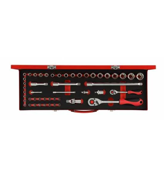 Verbindungsvierkant nach DIN 3120, ISO 1174, mit Kugelarretierung, Innenvierkantantrieb nach DIN 3120, ISO 1174, mit Kugelfangrille, 2K-Umschaltknarre, Rechts-/Linkslauf durch Hebel umschaltbar, Druckknopfauslösung, feinverzahnt, Ovaler Kopf, 2-Komponenten-Griff, handschonende Kraftübertragung, für Steckschlüsseleinsätze, Steckschlüsseleinsatz, 6-kant, metrisch, kurz, Ausführung nach DIN 3124, ISO 2725, Schraubendrehereinsatz 1/4″, für Innen-6-kant-Schrauben, mit eingepresstem, phosphatierten Stift
