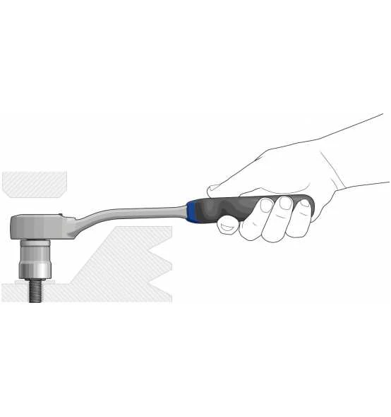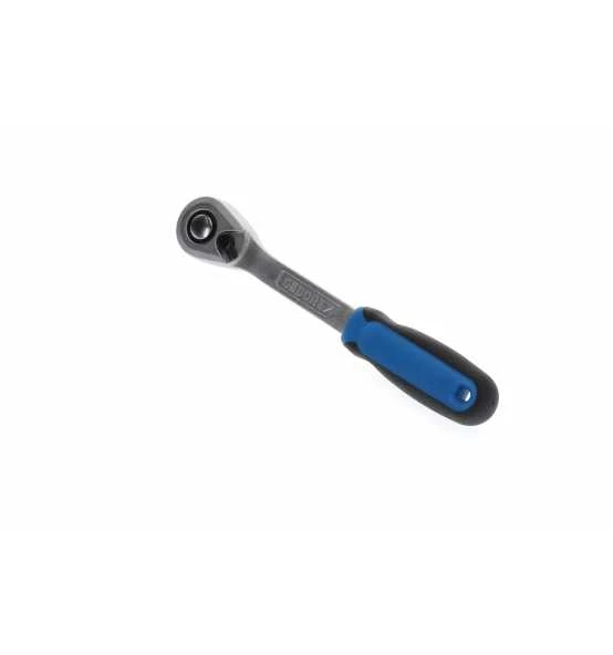 Universeller Einsatz in Industrie und Automotive, auch in beengten Bauräumen, Ausführung nach DIN 3122, ISO 3315, Stiel gekröpft für schwer zugängliche Stellen, Reduziert das Verletzungsrisiko der Finger beim Schrauben auf ebenen Flächen, Kleiner, tropfenförmiger Kopf für engste Schraubstellen, Feinverzahnt (60 Zähne), mit Umschalthebel und Druckknopfauslösung, Rückschwenkwinkel 6°, Rutschfester 2-Komponenten-Griff mit Aufhängeloch, Für handbetätigte Steckschlüsseleinsätze und Verbindungsteile mit Vierkantantrieb nach DIN 3120 – C 12,5, ISO 1174, mit Kugelarretierung, Vanadium-Stahl 31CrV3, verchromt