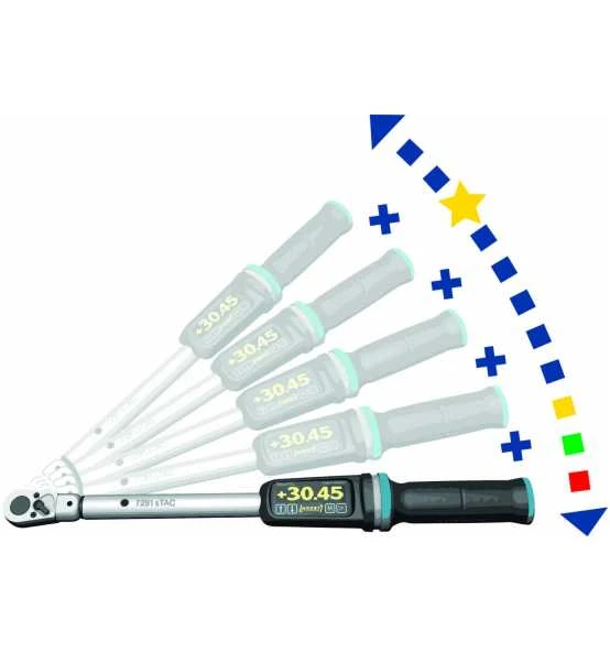 (Voraussetzung für korrekte Drehmoment- / Drehwinkelmessungen) - 4-fach Signalisierung des Schraubverlaufs durch Akustik-Signal (Summer), Vibration, mitlaufende Ziffernanzeige und rundum, aus jeder Lage, sichtbarer 360° LED-Anzeige mit „Ampelfunktion“