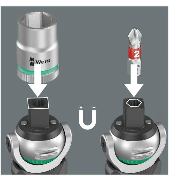 - Die magnetische Direktaufnahme macht aus der 3/8″-Knarre gleichzeitig einen Bit-Ratschenschraubendreher mit 1/4″-Bitaufnahme