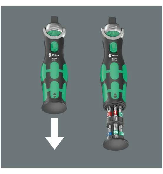 - Unverlierbares und schwenkbares Bit-Magazin zur einfachen Entnahme und sicheren Lagerung der Bits