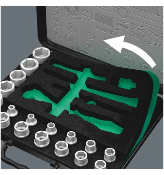 Mit 17 Zyklop Nüssen, 2 Zyklop Verlängerungen mit Schnelldrehhülse, 1 Quergriff, 1 Kardangelenk, 1 Wobble-Verlängerung, 1 Verbindungsteil mit Schnellwechselfutter, 13 Bits.Mit Werkzeugfinder „Take it easy“: Farbkennzeichnung nach Größen.