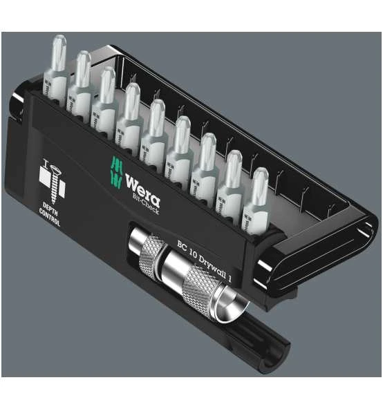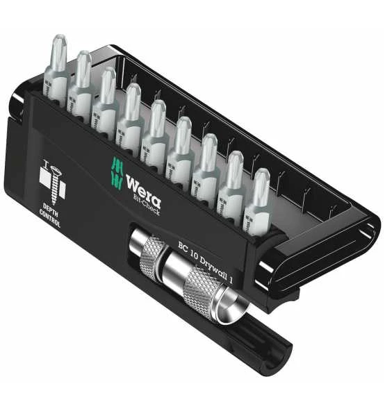 Bit-Check für Anwendungen im Trockenbau; hochwertiger Abstandshalter aus Aluminium; Schraubtiefe kann stufenlos eingestellt werden und ermöglicht das bündige Versenken von Schrauben; 9 Trockenbau Bits mit angepasstem Abtriebsschaft; Länge 25 mm