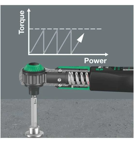 - Einfache Einstellung und Sicherung des gewünschten Drehmomentwertes mit hör- und fühlbarem Einrasten bei Erreichen der Skalenwerte
