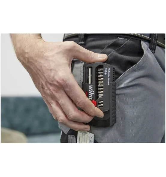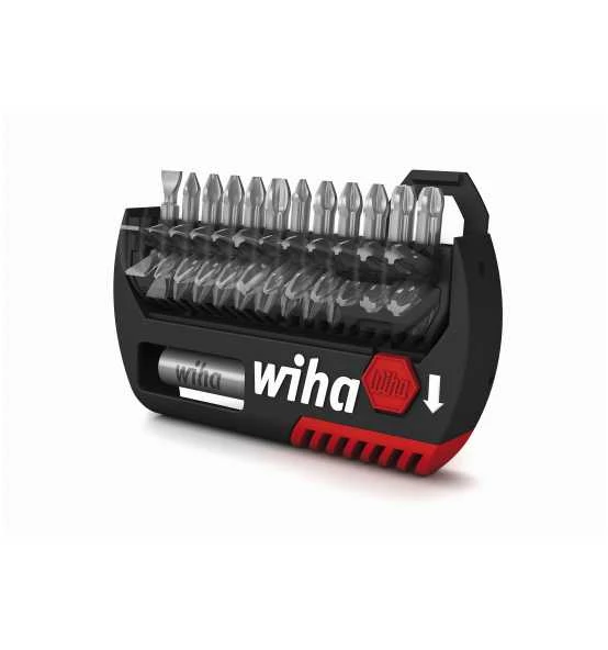 Anwendung: Wiha Logo nach unten schieben und schon sind die Bits zur Entnahme bereit.